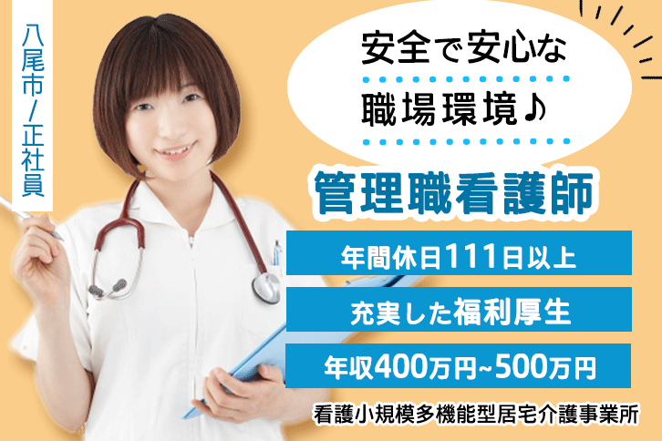 ≪八尾市/看護師(管理者)/正社員≫年収400万円~500万円!年間休日111日以上!手当充実♪看護小規模多機能型居宅介護でのお仕事です★(osa)