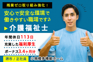 ≪堺市/介護福祉士/正社員≫賞与3.4ヶ月分♪スタッフの負担軽減に取り組んでいます◎残業ゼロ取り組み強化!看多機で介護のお仕事です☆(osa)