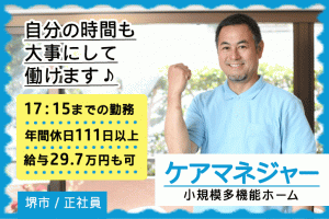 ≪堺市/ケアマネジャー/正社員≫年間休日111日以上!月収例29.7万円!17:15までの勤務◎看護小規模多機能型居宅介護事業所でのお仕事です★(osa)