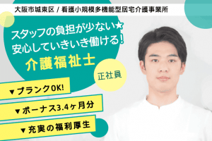 ≪大阪市城東区/介護福祉士/正社員≫賞与3.4ヶ月分♪スタッフの負担軽減に取り組んでいます◎残業ゼロ取り組み強化!看多機で介護のお仕事です☆(osa)