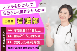 ≪大阪市城東区/看護師/正社員≫月収例29.5万円以上!年間休日111日以上!復職支援実施中♪看護小規模多機能型居宅介護でのお仕事です★(osa)