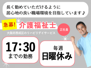 ≪大阪市西成区/介護福祉士/正社員≫毎週(日)休み!賞与2.0ヶ月分◎17:30までの勤務★デイサービスで介護のお仕事です☆(osa)