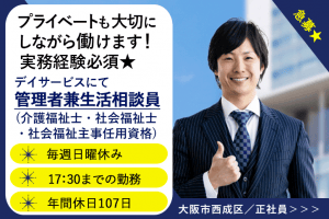 ≪大阪市西成区/管理者兼生活相談員(介護福祉士・社会福祉士・社会福祉主事任用資格)/正社員≫急募★(日)休み!月収例35万円♪17:30までの日勤のみ★年間休日107日!デイサービスで施設の管理・運営のお仕事です☆(osa)