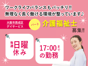 ≪大阪市西成区/介護福祉士/パート≫週4日~の勤務◎毎週(日)休み!17:00までの勤務★デイサービスで介護のお仕事です☆(osa)
