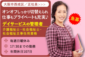 ≪大阪市西成区/管理者(介護福祉士・社会福祉士・社会福祉主事任用資格)/正社員≫急募★(日)休み!月収例25.5万円♪17:30までの日勤のみ★年間休日107日!デイサービスで施設内業務と施設管理のお仕事です☆(osa)