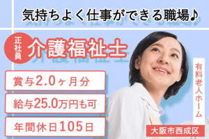 ≪大阪市西成区/実務者研修修了/正社員≫月収例25.0万円♪賞与2.0ヶ月分◎急募★年間休日105日!住宅型有料老人ホームで介護のお仕事です☆(osa)