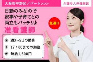 ≪大阪市平野区/准看護師/パート≫急募!!時給例1600円♪日勤のみ!週3~5日の勤務◎住宅型有料老人ホームで看護のお仕事です☆(osa)
