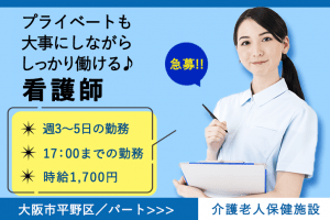 ≪大阪市平野区/看護師/パート≫急募!!日勤のみ!週3~5日の勤務◎時給例1700円♪住宅型有料老人ホームで看護のお仕事です☆(osa)