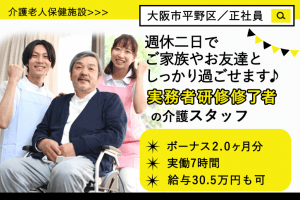 ≪大阪市平野区/実務者研修修了/正社員≫日勤のみ◎実働7時間◎月収例27.0万円♪賞与あり!老健で介護のお仕事です☆(osa)