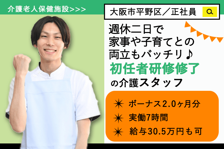 ≪大阪市平野区/初任者研修修了/正社員≫日勤のみ◎賞与あり◎月収例27.0万円♪実働7時間◎老健で介護のお仕事です☆(osa)