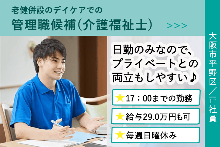 ≪大阪市平野区/管理職候補(介護福祉士)/正社員≫急募★(日)休み!月収例29.0万円♪17:00までの日勤のみ★老健併設のデイケアで管理職のお仕事です☆(osa)