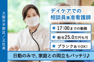 ≪大阪市平野区/准看護師(相談員)/正社員≫日勤のみ!17:00までの勤務★月収例25.0万円♪デイケアで看護・相談員のお仕事です☆(osa)