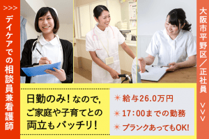 ≪大阪市平野区/看護師(相談員)/正社員≫17:00までの日勤のみ!月収例26.0万円♪デイケアで看護・相談員のお仕事です☆(osa)