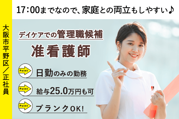≪大阪市平野区/准看護師(管理職候補)/正社員≫日勤のみ!17:00までの勤務★月収例25.0万円♪デイケアで看護のお仕事です☆(osa)