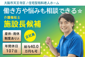 ≪大阪市天王寺区/施設長候補(介護福祉士)/正社員≫月収例40万円◎年間休日107日!残業ほぼナシ♪住宅型有料老人ホームで施設長候補のお仕事です☆(osa)