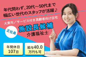 ≪大東市/施設長候補(介護福祉士)/正社員≫月収例40万円◎年間休日107日!残業ほぼナシ♪サービス付き高齢者向け住宅で施設長候補のお仕事です☆(osa)