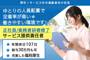 ≪堺市/サービス提供責任者(実務者研修修了)/正社員≫年間休日107日!月収例30万円◎働き方や悩みも相談できる♪サービス付き高齢者向け住宅でのお仕事です☆(osa)