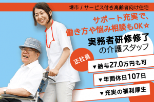 ≪堺市/実務者研修修了/正社員≫年間休日107日!月収例27万円◎働き方や悩みも相談できる♪サービス付き高齢者向け住宅でのお仕事です☆(osa)