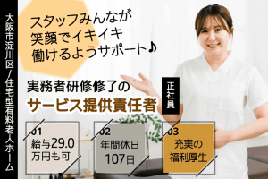 ≪大阪市淀川区/サービス提供責任者(実務者研修修了)/正社員≫年間休日107日!月収例30万円◎働き方や悩みも相談できる♪住宅型有料老人ホームでのお仕事です☆(osa)