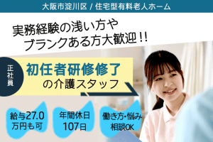 ≪大阪市淀川区/初任者研修修了/正社員≫月収例27万円◎年間休日107日!経験の浅い方やブランクのある方も大歓迎!住宅型有料老人ホームでのお仕事です☆(osa)