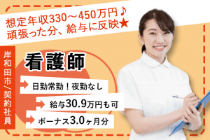 ≪岸和田市/看護師(日勤)/契約社員≫賞与3.0ヶ月分♪月収例35.1万◎想定年収330~500万円!!外来診療補助制度☆正社員登用あり★職員食堂あり!病院でのお仕事です☆(kyo)