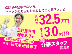 ≪岸和田市/初任者研修修了/契約社員≫賞与3.0ヶ月分♪職員食堂あり!正社員登用制度あり◎外来診療補助制度☆病院で看護助手のお仕事です☆(osa)