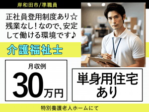 ≪岸和田市/介護福祉士/準職員≫★月収例32.5万円~★単身用住宅あり★賞与3.0ヶ月分★正社員登用制度★研修充実★手当も各種あり!★特別養護老人ホームでのお仕事です☆