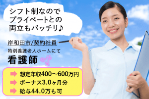≪岸和田市/看護師/契約社員≫賞与3.0ヶ月分♪月収例44.0万◎想定年収400~600万円!!外来診療補助制度☆特養でのお仕事です☆(kyo)