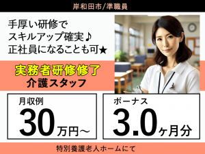 ≪岸和田市/実務者研修修了/準職員≫★賞与3.0ヶ月分◎手厚い研修◎想定年収310万円~460万円◎福利厚生充実◎正社員登用制度◎諸手当も多数あり!★特別養護老人ホームでのお仕事です☆