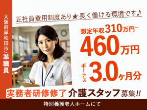 ≪岸和田市/実務者研修修了/準職員≫★賞与3.0ヶ月分◎手厚い研修◎想定年収310万円~460万円◎福利厚生充実◎正社員登用制度◎諸手当も多数あり!★特別養護老人ホームでのお仕事です☆