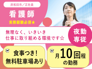 ≪岸和田市/看護師/正社員≫夜勤専従♪月10回程度の勤務☆食事つき!無料駐車場あり◎サービス付き高齢者向け住宅でのお仕事です☆(osa)