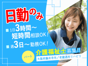 ≪藤井寺市/介護福祉士/パート≫週3日~OK♪1日3時間~相談できる◎日勤のみ◎通所リハビリテーションでのお仕事です☆