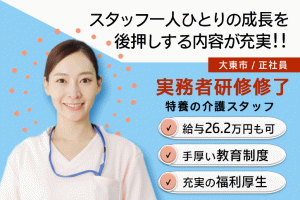 ≪大東市/実務者研修修了/正社員≫手厚い教育制度◎月収例26.2万円♪福利厚生が充実★特養で介護のお仕事です☆(osa)