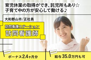 ≪大和郡山市/訪問看護師/正社員≫託児所あり◎月収例35.0万円♪賞与2.4ヶ月分★年間休日107日!訪問看護ステーションでのお仕事です★(kyo)