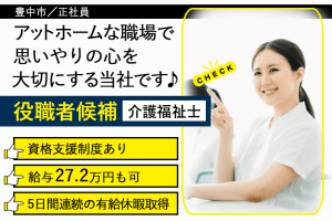 ≪豊中市/介護福祉士(役職者候補)/正社員≫主任の月収例28.5万円~♪アットホームな職場◎資格支援制度あり★5日間連続の有給休暇取得◆小規模多機能型居宅介護・住宅型有料老人ホームで介護のお仕事です☆(osa)
