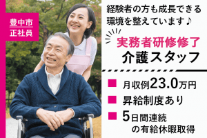 ≪豊中市/実務者研修修了/正社員≫5日間連続の有給休暇取得◆資格支援制度あり★アットホームな職場◎月収例23.0万円♪小規模多機能型居宅・住宅型有料老人ホームでのお仕事です☆(kyo)