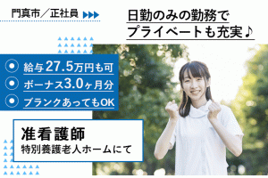 ≪門真市/准看護師/正社員≫賞与3.0ヶ月分◎日勤☆月収例27.5万円♪特養でのお仕事です☆(osa)