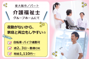 ≪東大阪市/介護福祉士/パート≫夜勤も残業もなし♪自転車・バイク通勤可★週2、3日~勤務OK◎グループホームで介護のお仕事です☆