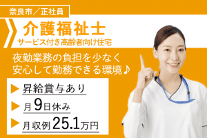 ≪奈良市/介護福祉士/正社員≫◆月収例27.2万円◇月9日休み◇昇給賞与あり◆サービス付き高齢者向け住宅でのお仕事です☆(kyo)