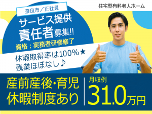 ≪奈良市/サービス提供責任者(実務者研修修了)/正社員≫残業ほぼなし◆社内研修制度◆月収例31.0万円◆月9日休み◆退職金制度あり◆サービス付き高齢者向け住宅でのお仕事です☆(kyo)