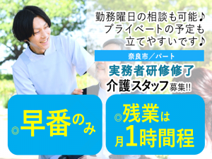 ≪奈良市/実務者研修修了/早番パート≫★勤務曜日相談可◎早番のみ◎時給例1,330円★サービス付き高齢者向け住宅でのお仕事です☆(kyo)