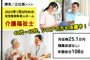 ≪堺市/介護福祉士/正社員≫2023年1月OPEN◆月収例27.2万円◆年間休日120日◆社食あり◆残業ほぼなし◆社内研修制度◆住宅型有料老人ホームでのお仕事です☆(kyo)