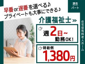 ≪堺市/介護福祉士/パート≫週2日~勤務OK!選べる早番or遅番☆正社員登用実績多数★残業ほぼなし◎時給1,380円♪住宅型有料老人ホームでのお仕事です☆(kyo)