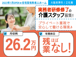 ≪堺市/実務者研修修了/正社員≫2023年1月OPEN◆残業ほぼなし◆社食あり◆月収例26.2万円◆年間休日120日◆退職金制度あり◆住宅型有料老人ホームでのお仕事です☆(kyo)