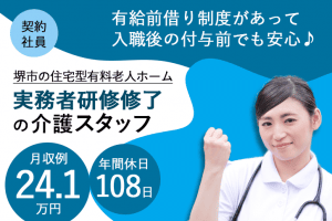 ≪堺市/実務者研修修了/契約社員≫月収例26.2万円◆年間休日108日◆退職金制度あり◆住宅型有料老人ホームでのお仕事です☆(osa)
