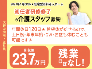 ≪堺市/初任者研修修了/正社員≫2023年1月OPEN◆月収例25.5万円◆残業ほぼなし◆社内研修制度◆年間休日120日◆退職金制度あり◆住宅型有料老人ホームでのお仕事です☆(kyo)
