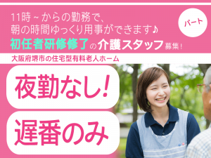 ≪堺市/初任者研修修了/遅番パート≫★夜勤なし◆遅番のみ11時~◆昇給年1回20円UP◆勤務日数相談可◆時給例1,114円★住宅型有料老人ホームでのお仕事です☆