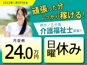 ≪堺市/介護福祉士/正社員≫2023年1月OPEN◆月収例24.0万円◆年間休日108日◆日曜休み◆社内研修制度◆デイサービスでのお仕事です☆(osa)