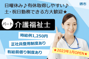 ≪堺市/介護福祉士/パート≫2023年1月OPEN◆時給1,380円◆土・祝日勤務できる方大歓迎◆日曜休み◆有休取得しやすい◆デイサービスでのお仕事です☆(osa)