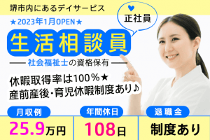 ≪堺市/生活相談員(社会福祉士)/正社員≫年間休日108日◆社食あり◆社内研修制度◆2023年1月OPEN◆月収例25.9万円◆デイサービスでのお仕事です☆(osa)